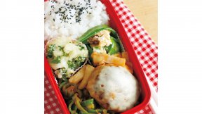 チーズが表面をコーティングするので、時間がたってもジューシーなハンバーグのお弁当。トマトケチャップ&ソースで手軽に洋食風の味わいになります。