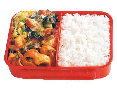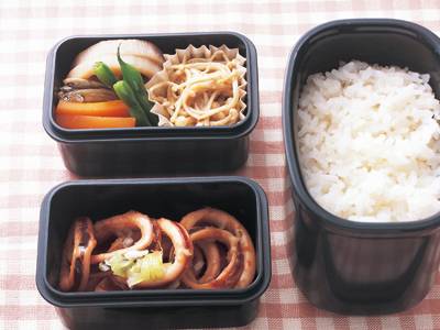 野菜がたっぷりで、彩りのきれいな理想的なお弁当。市販の調味料を使って手早くつくります。調理器具を使い分けて、効率よく。