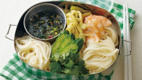 ねぎの香りが爽やかなエスニック風のたれで楽しむそうめん弁当。具のえびとなすは電子レンジで手軽に。