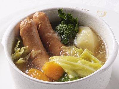 大ぶりに切った野菜とソーセージをスープでじっくり煮込みます。ホックリ煮えた具と絶品のスープ、とことん味わってみましょう。
