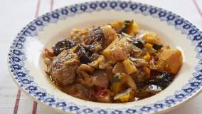 【プルーンのカポナータでアレンジ】合いびき肉にクミンシードをたっぷりと混ぜ入れて焼きつけ、カポナータとともにさっと煮ればエスニックなおいしさに。