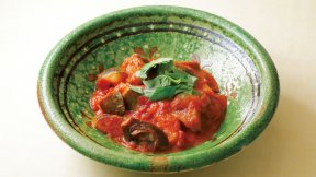 にんにく風味の香ばしい油でなすとトマトを炒めて蒸し煮に。トマトの甘みを吸ったなすは、ふっくらジューシー。