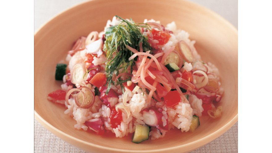 トマトとたこの赤が華やか。具と合わせ酢を先に混ぜておけば、すし飯をつくる手間も省けます。