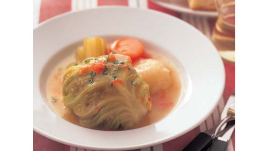 キャベツは、胃粘膜を保護するビタミンUやビタミンCなど、栄養たっぷりの野菜です。ビタミンCは芯の周辺に多く含まれているので、芯の部分までやわらかく調理できるロールキャベツは、キャベツの栄養を丸ごといただくのにおすすめのおかずです。
