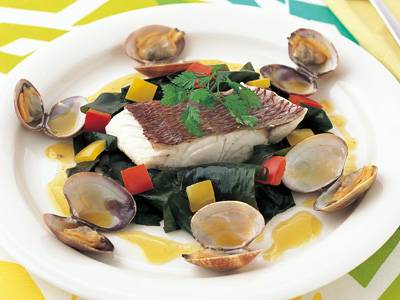 たいは、ソテーしてから酒蒸しにするのがコツ。油のコクと香ばしさで、グッとおいしくなります。