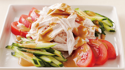 電子レンジにかけたあと、蒸らしながら冷ますことで柔らかくなります。蒸し汁をからめてよりしっとりと仕上げます。野菜をたっぷり添えサラダ感覚でどうぞ!