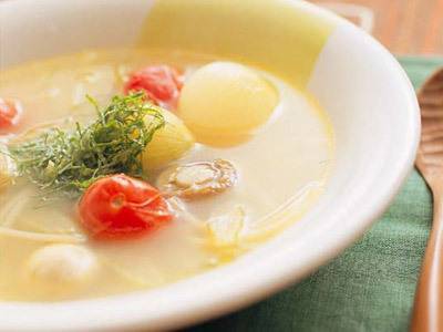 たまねぎの甘みをじゅうぶんに引き出した野菜スープ。たまねぎがスープの色と同じになったらでき上がりです。