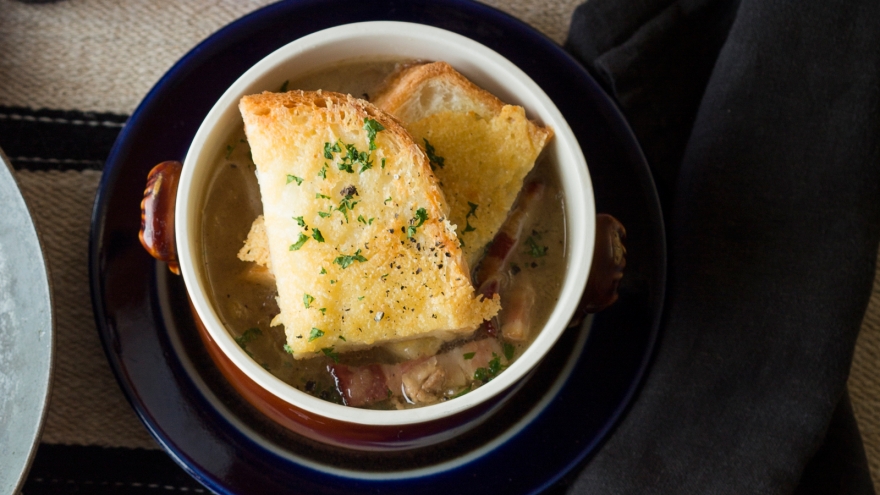 短時間で仕上げたとは思えないコクとうまみの絶品スープ。あめ色たまねぎ、フライパントーストなど、目からウロコの工夫がいっぱい!