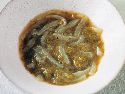 うまみ豊かで柔らかなあじと、ツルッとしたところてんを、みりんで甘みをつけた三杯酢でどうぞ。