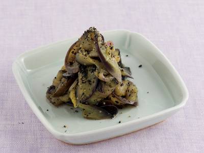 なすの皮をしょうゆで煮ると、おいしいはし休めになります。