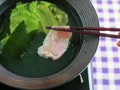 うまみの濃い豚ロース肉を使ったしゃぶしゃぶは、独特のコクがおいしい。わかめとレタスも、相性抜群。