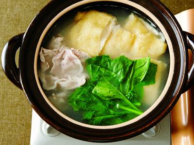 常夜鍋とは、毎晩食べても飽きない鍋という意味。豚肉、ほうれんそうなどをあっさりと煮ます。餅入り油揚げを加えて、ボリュームあるレシピです。
