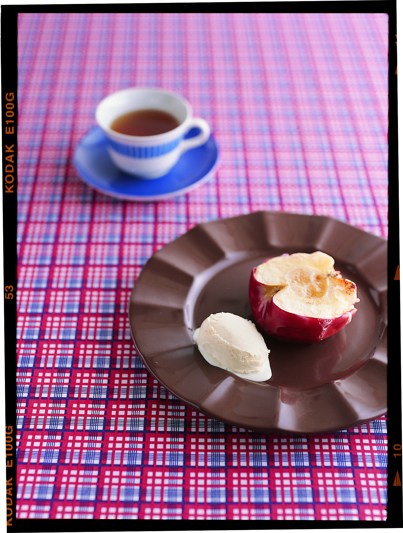 りんごにバター、砂糖を詰めてアツアツに焼いて。冷たいアイスが、抜群の組み合わせです!