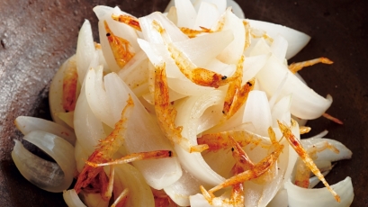 新たまねぎはくし形に切ってシャキシャキ感が残るくらいに炒めます。香ばしくいった桜えびの風味が、味の決め手です。