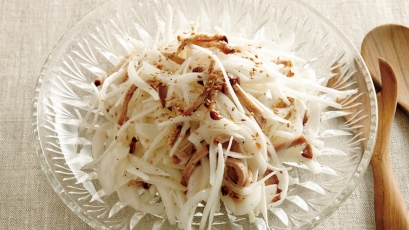 新たまねぎのみずみずしさと食感が楽しめるサラダです。細切りにした焼き豚はたまねぎとよくなじみます。