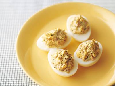 黄身を取り出して、ツナとマヨネーズであえて、また詰めます。おしゃれな一品に!