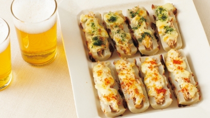 縦半分に切ったちくわの溝を利用した楽しい一品です。身近な食材でパッとつくれます。子どもにも大人にも喜ばれること間違いなし!おやつや酒の肴(さかな)に。お弁当にも重宝します。
