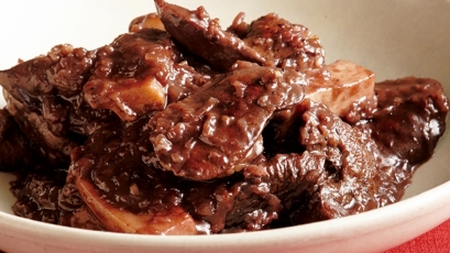 相性のよい赤ワインで煮込むと、レバーの濃厚なおいしさが楽しめます。「エリンギの歯ごたえ」と「はちみつの甘み」でおいしさをアップ!
