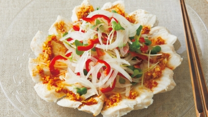 電子レンジで蒸すので手軽にできます。切ったあとに蒸し汁をからめることで、むね肉がパサつかず、しっとりします。たっぷりの野菜を風味のよいたれでいただきます。