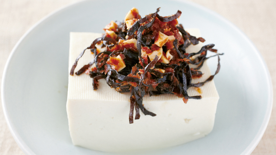 【冷ややっこのトッピングバリエーション】昆布とおかかで定番の和風味。カリッとしたナッツの食感が新鮮!