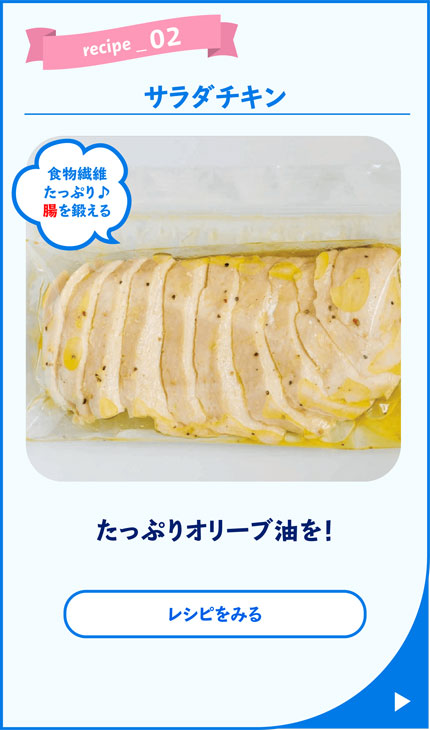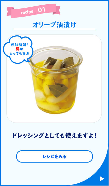 腸を鍛えるもうひとつのオススメの方法は、オリーブ油を摂ることです。実はオリーブ油は良質な脂肪酸のオレイン酸や食物繊維が含まれており、便秘解消にもつながる腸がとっても喜ぶ調味料なんです。