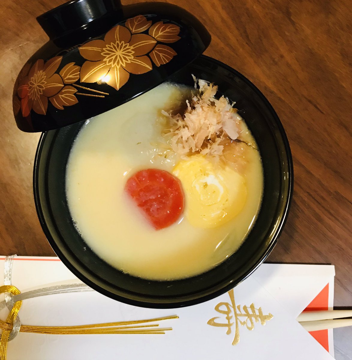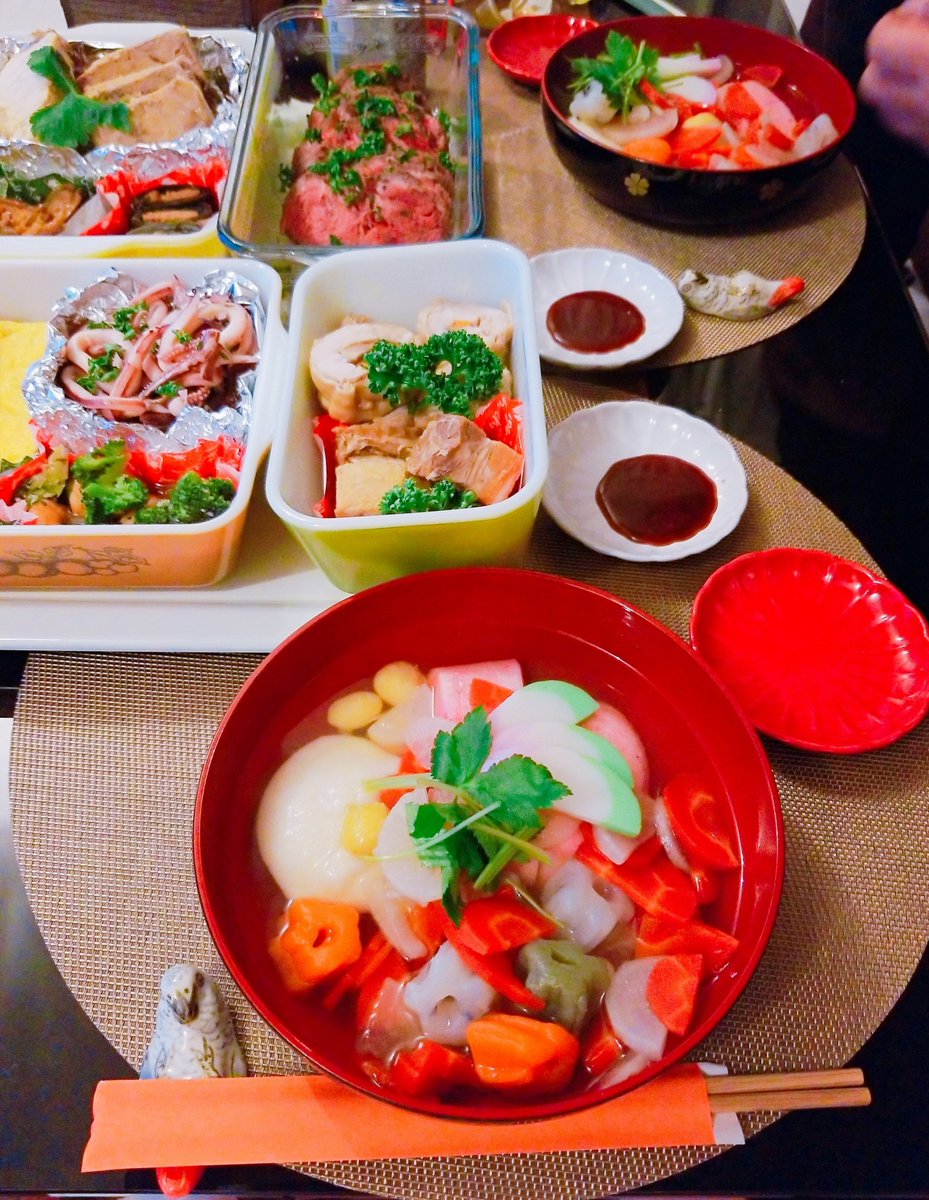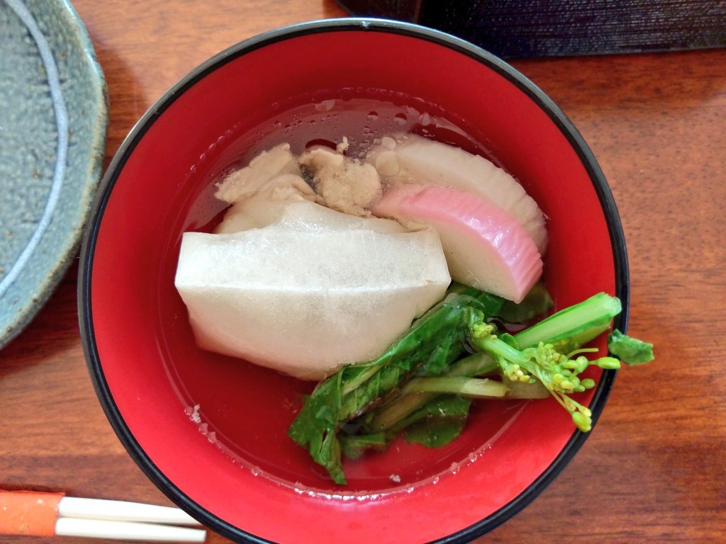 いたって地味な醤油のすまし汁。魚と鶏肉の出汁です。具はお節の中身をいくつか。