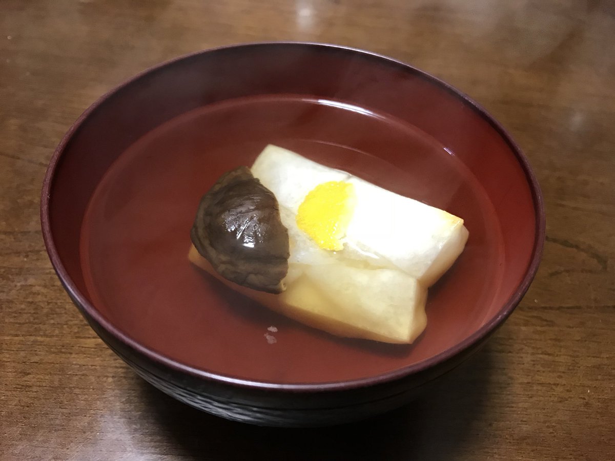 かつお節、昆布、干し椎茸で取った出汁に具は出汁に使った干し椎茸のみのシンプルイズベストなお雑煮。一応柚子がアクセント(笑)