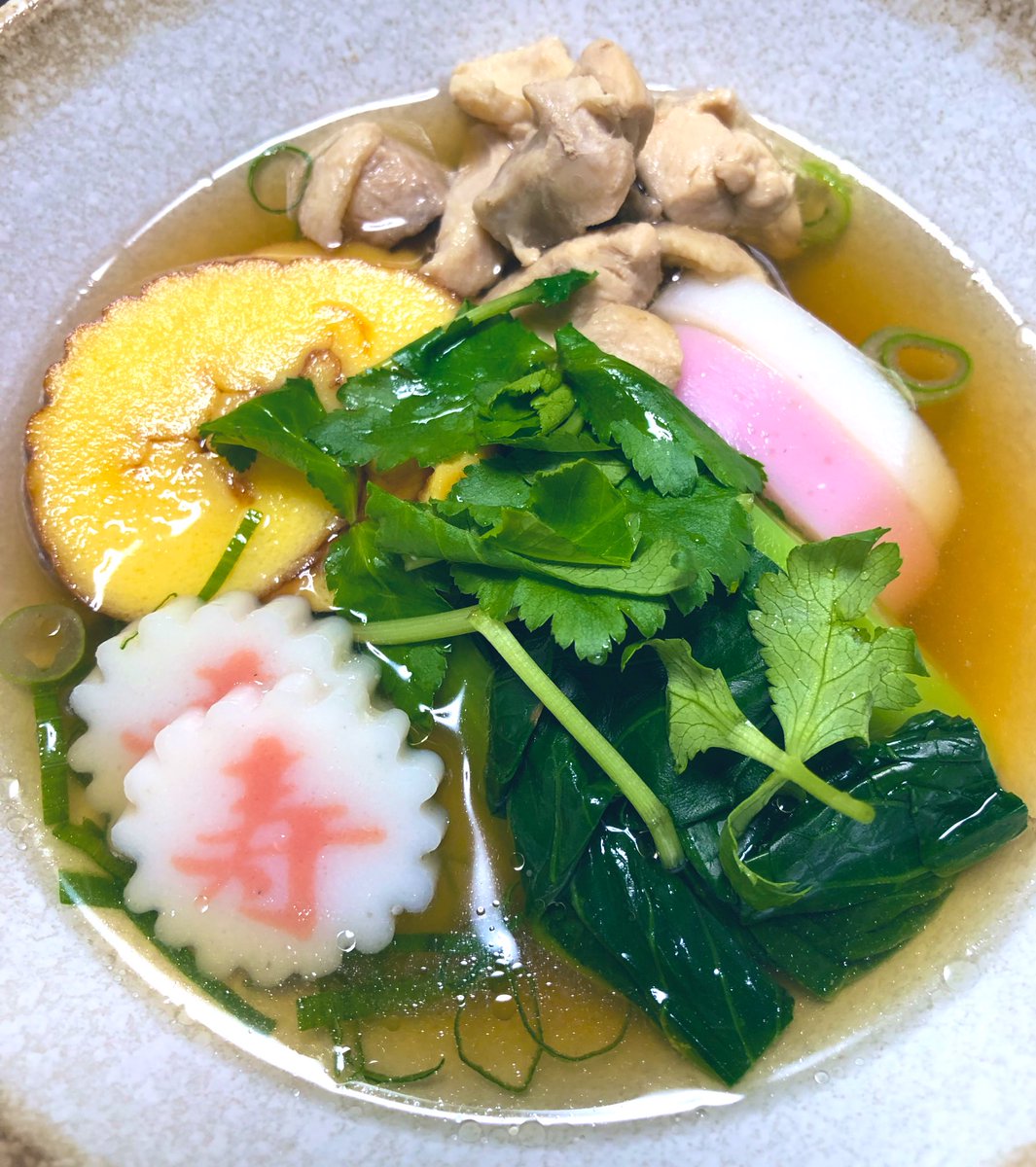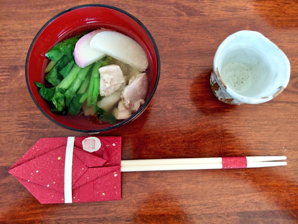 白出汁、軽く焼いた白餅と海老餅、3色こんにゃく、雑煮大根、金時人参、銀杏、蒲鉾、三つ葉。今年は生麩と鶏肉は省略。