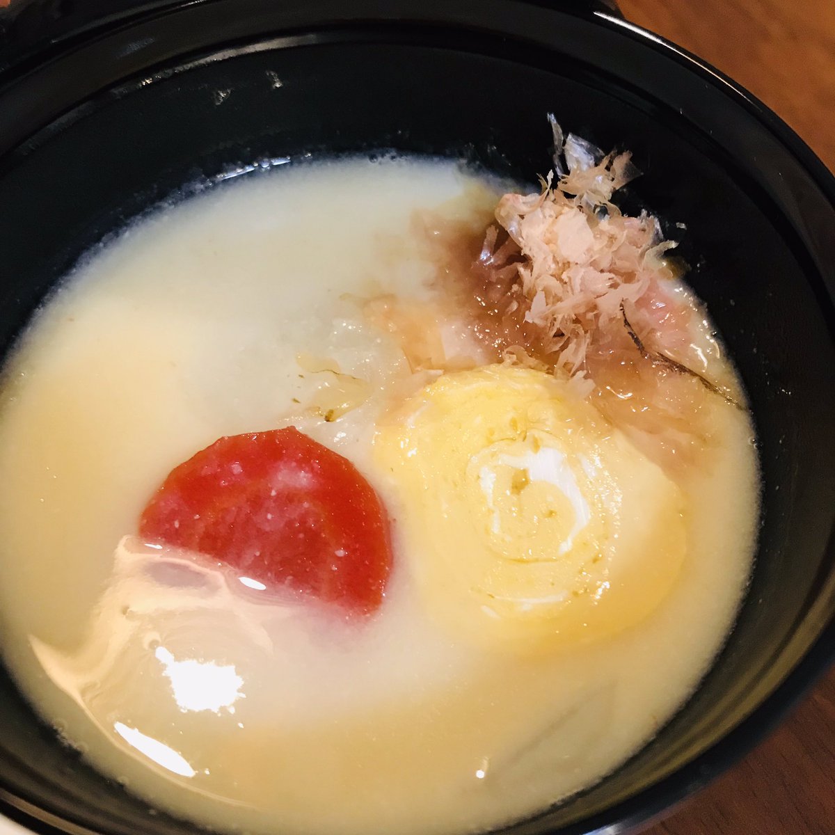 白味噌のお雑煮 お正月気分が少し味わえた 昆布出汁に白味噌 具材は昆布出汁で茹でた祝大根、金時人参に 何故かうちは甘めの卵焼きを入れて、鰹節。