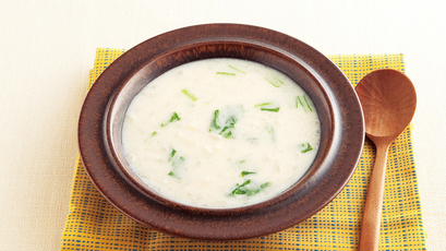 栄養豊富な豆乳と緑の野菜を合わせたヘルシーなスープ。仕上げに塩分と香りの強いブルーチーズを入れて、味にアクセントを。