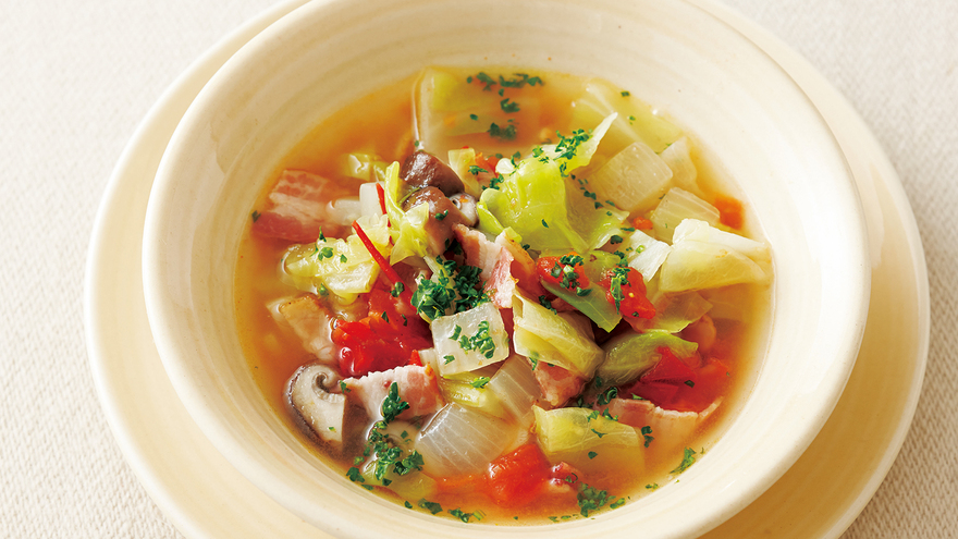 具材は小さめに形をそろえて切ると、火が通りやすく、風味がよく出ます。 粉チーズやゆでたショートパスタを加えてもおいしくいただけます。