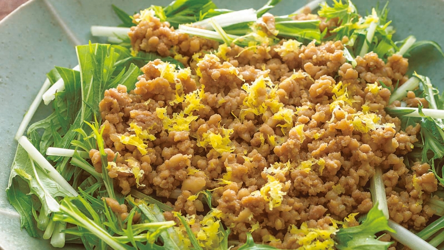シャキシャキの水菜に温かいそぼろをのせると程よくしんなりして食べやすくなります。柚子(ゆず)の皮を散らして、見た目も香りも華やかに仕上げます。