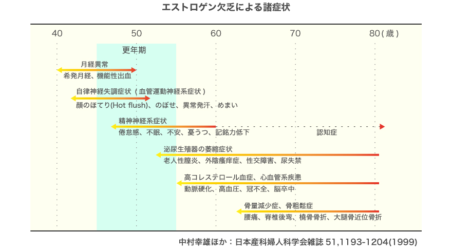 「突然の『のぼせ』、『ほてり』、『発汗』、動悸、頭痛、肩こり、不眠など、さまざまな症状が現れますが、人によっては、抑うつ、倦怠感、不安感、落ち込みなどの精神状態が強く出ることもあり、その他、エストロゲンのサポートがなくなると、骨が弱くなったり、血管が硬くなったり、代謝が落ちて太りやすくなるなど、さまざまな影響が出てくるわけです」と小林先生。