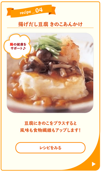 中でも大豆食品「おから」・「豆腐」は腸が喜ぶ食物繊維が豊富。また食物繊維以外の栄養成分もしっかりとることができます。大豆由来の良質なたんぱく質やビタミンEにカルシウムなども含んでおり、栄養バランスの底上げにも役立つので、是非毎日の食事に取り入れてみてください。
