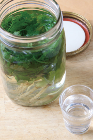 パクチーは根がついたまま使用。たっぷりの水でよく洗い、特にひげ根の部分をきれいにする。よく水気を拭きとったら、広口のガラス容器にパクチーと砂糖を入れ、ホワイトリカーを注ぐ。1ヶ月ほど置いたら飲み頃に。取り出したパクチーも刻んで有効利用を。