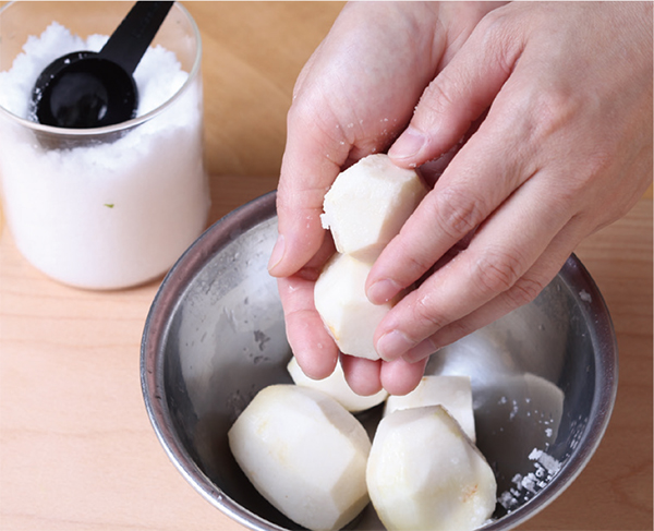 さといもにはぬめりがあるので、そのまま煮込んでも調味料が中心まで染み込みにくい。中までしっかりと味を染み込ませるには、ぬめりを取る下処理を。