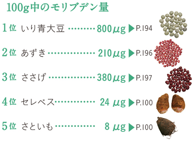 人が活動するのに必要な代謝に関わるミネラルで、肝臓や腎臓にあります。体に必要なモリブデン量は微量であることから、通常の食事から十分に摂取することができますが、欠乏すると貧血や頻脈、頭痛、夜盲症、尿酸代謝障害、不妊などになりやすくなるといわれています。食品の中に含まれる量は微量なので、正確に量を測ることはできませんが、さといもや豆類などに多く含まれています。
