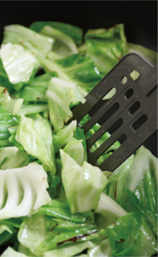 キャベツには脂溶性のβ-カロテンがわずかに含まれる。β-カロテンは加熱しても安定なので、大きな鍋を使い、高温に熱したら、一気に調理。こうすると水っぽくならず、ビタミンCを閉じ込めたまま仕上がるので、結果的にはビタミンCの残存率が高くなる。