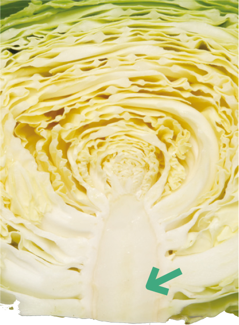 主に食用にしている葉の部分と、白い芯の部分の栄養を比較してみると、芯の部分にはカルシウムやカリウム、リン、マグネシウムなどのミネラル類が葉の倍以上含まれている。生食の際に廃棄してしまいがちだが、薄くそいだり、細かく刻めば食べやすくなる。せっかくの栄養成分を無駄にしないように。