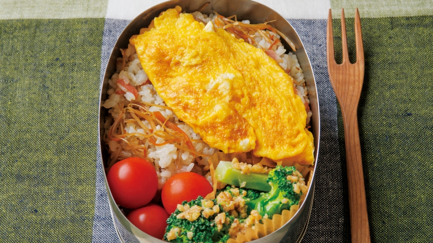 きんぴら入りの炒めご飯に小さなオムレツをのせ、見た目にも楽しいお弁当。 サブおかずとミニトマトで彩りを添えます。