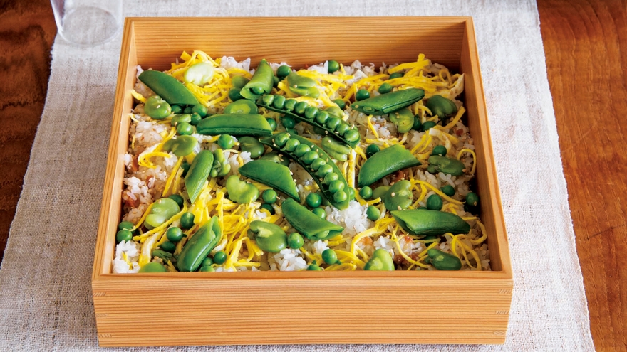 春らしいご飯物。豆の緑と卵の黄色が目にまぶしい、まさしく新緑のちらしずしです。梅を混ぜ込むとご飯が傷みにくくなるので、持ち寄りにも。