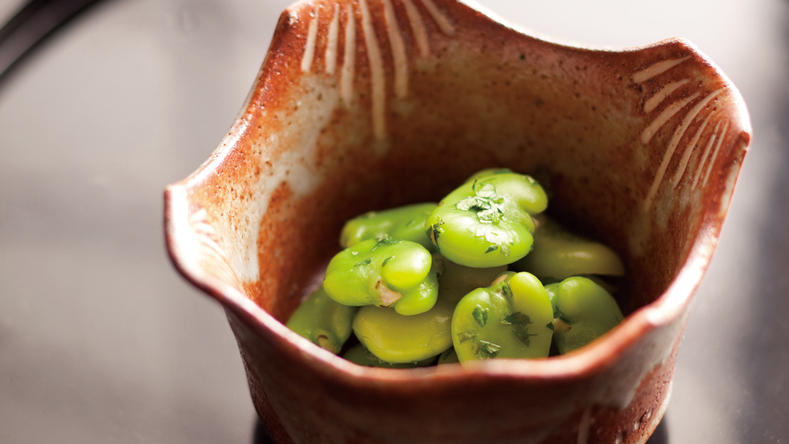 そら豆をサッと煮てすぐに冷やすのがひすいのような美しい色のコツ。そのままゆっくりと時間をかけて味を含ませます。