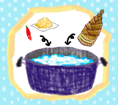 →米ぬかと赤とうがらしを入れてえぐみを取り除きます。