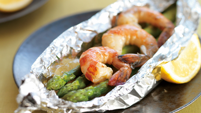 えびとじゃがいもと一緒に、アスパラガスを並べ、ホイルに包んでフライパンで蒸すのみ。ホイルを開けた瞬間の香りがたまらない!ナイフとフォークでちょこっと優雅にどうぞ!