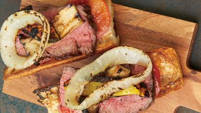 大宮シェフのアウトドア料理をご紹介。究極の焼き加減は、ミディアムレアとミディアムの間のロゼ。肉らしいうまみに“焼き”の香ばしさが加わり、みごとに、おいしさが凝縮されています。