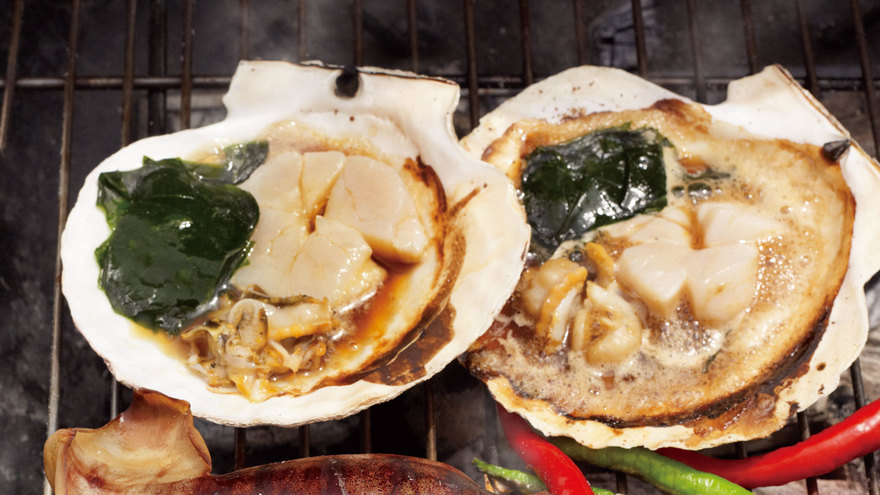 貝を鍋に見立て、殻ごと火にかける豪快な料理。貝柱が白くなり、グツグツいってきたところが、おいしいタイミング。
