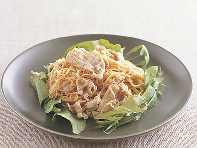 髙城 順子 380kcal 15分 カッペリーニ、豚もも肉、ベビーリーフ、塩、しょうゆ、他