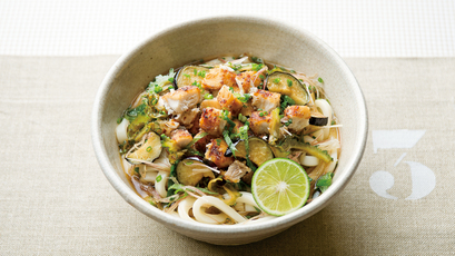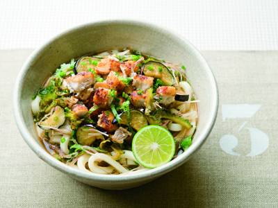 竜田揚げを小さく切ってのせた、ぶっかけうどんのぜいたく版です。香味野菜をたっぷりのせてすだちを搾れば、さっぱりしておいしい。