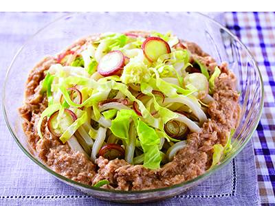 シャキシャキとした浅漬けキャベツの食感や、香味野菜の香りが夏にピッタリ!オリーブ油の風味とコクを加えるのがポイントです。