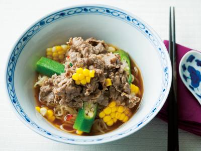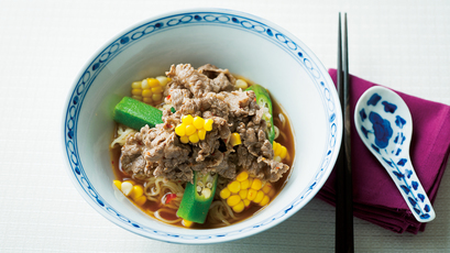 吉田 勝彦 540kcal 20分 中華麺、とうもろこし、オクラ、牛切り落とし肉、しょうゆ、他
